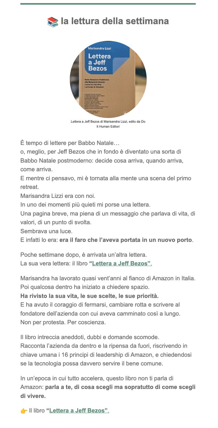 Cosa è uscito (e perché conta)In queste settimane Lettera a Jeff Bezos ha continuato a generare conversazioni vere, stratificate, alcune anche scomode. Ed è forse questo il segnale più importante.